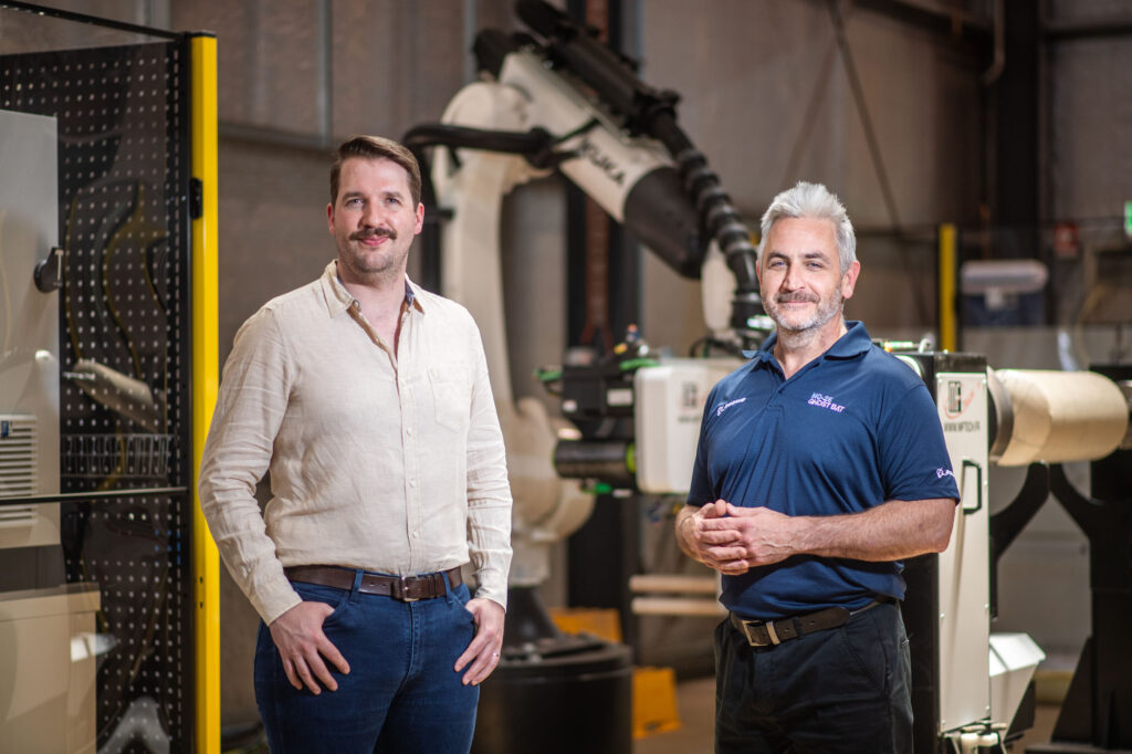 Left Dr Tristan Shelley UniSQ. Right Mykl Devlin Boeing in front of UniSQ Robotic Filament Winding Machine.